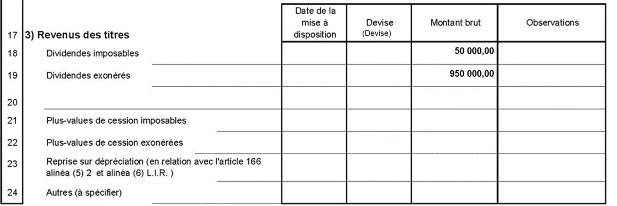 Dans le cadre de la mise en œuvre du formulaire 506A, l’administration des contributions directes propose une autre formulation de la problématique de la non-déductibilité des charges. Plutôt que de considérer que les charges en lien directe avec le revenu exonéré d’une SOPARFI ne sont pas déductibles, l’administration préfèrera une présentation selon laquelle les revenu sont imposables à concurrence des charges en relation directe avec la participation et exonérées pour le surplus. Ces deux formulations reviennent bien sûr au même résultat.